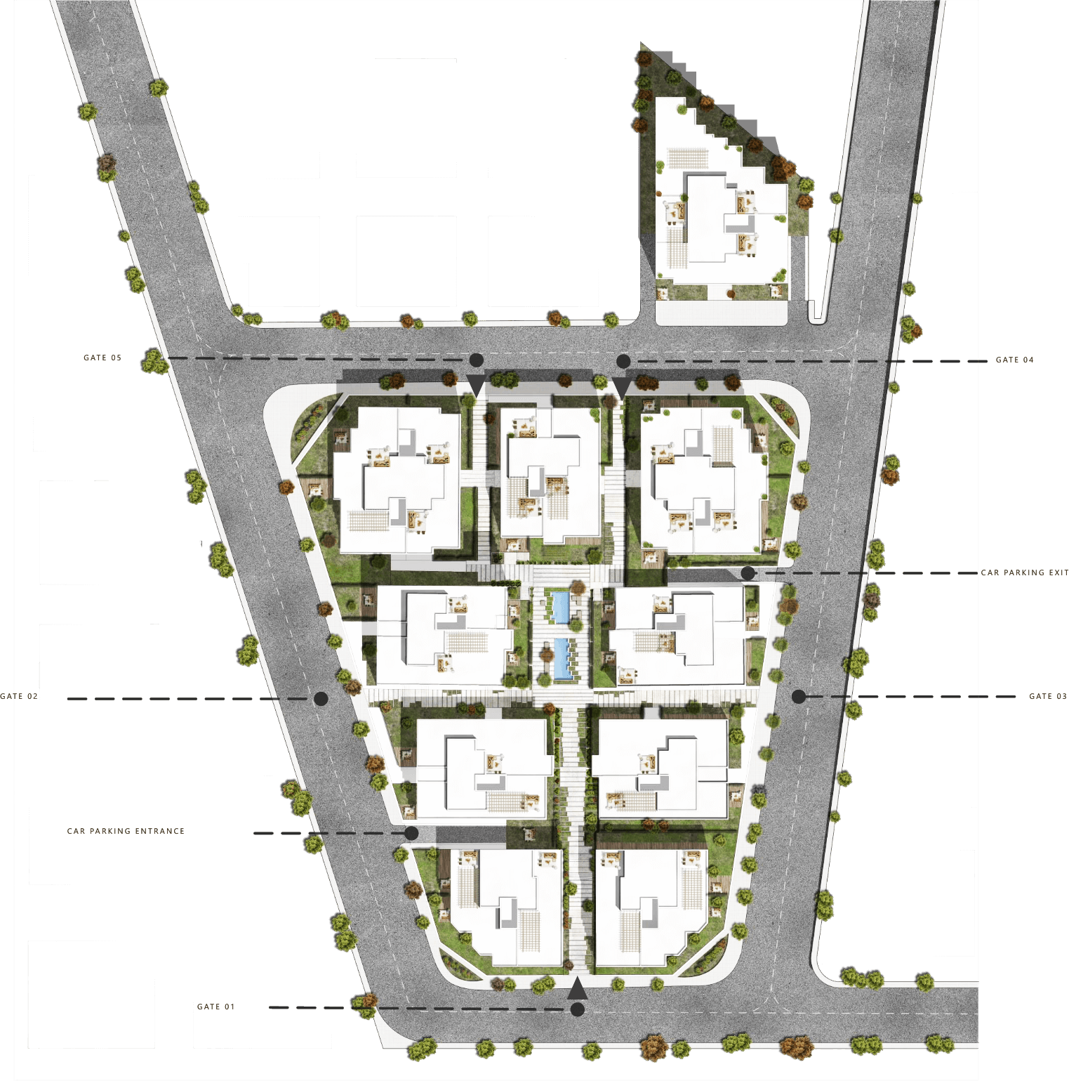 Moreover, the allocations of the buildings are maintained to suit the air currents for a breathable surrounding.
